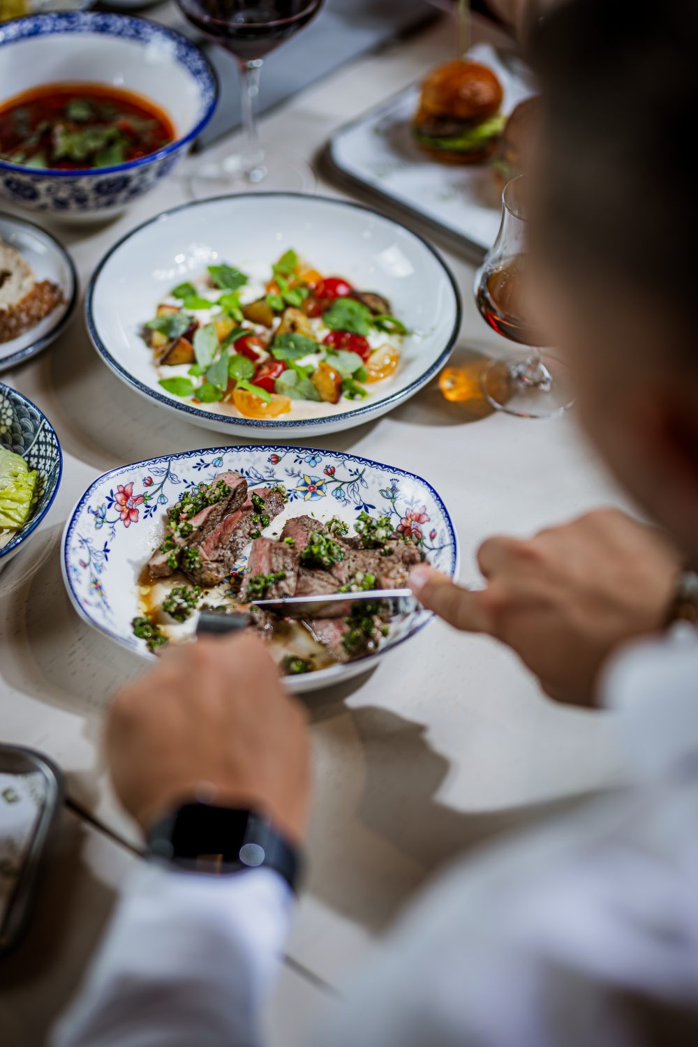 Ez nem egy csendes, szabályos vacsorahely – itt mozognak a vendégek, beszélgetnek, kérdeznek, közösen kóstolnak. Mindez nem zavaró: ez a stílus része.