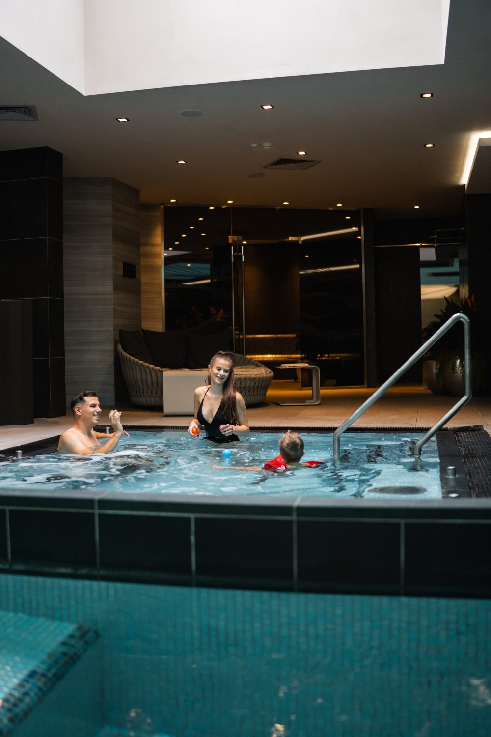 Vnútorný areál ponúka dokonalé podmienky na relaxáciu: bazén s vírivkou, detský bazén, biosaunu, fínsku a infračervenú saunu, soľnú komoru a parnú miestnosť pre celkovú telesnú a duševnú harmóniu. Kombinovaný vnútorný bazén s teplotou 34-36 °C zahŕňa aj detský bazén, vírivku a ďalšie masážne funkcie.